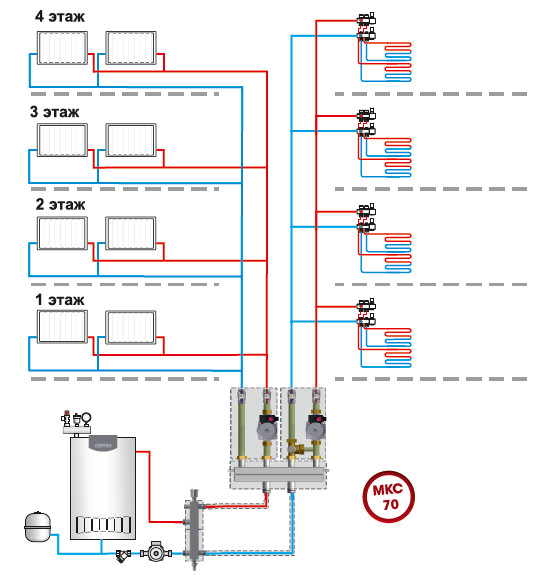 Типовые схемы применения МКС 70 / МКС 100 с напольным котлом в помещение площадью 111 - 170 кв.м.