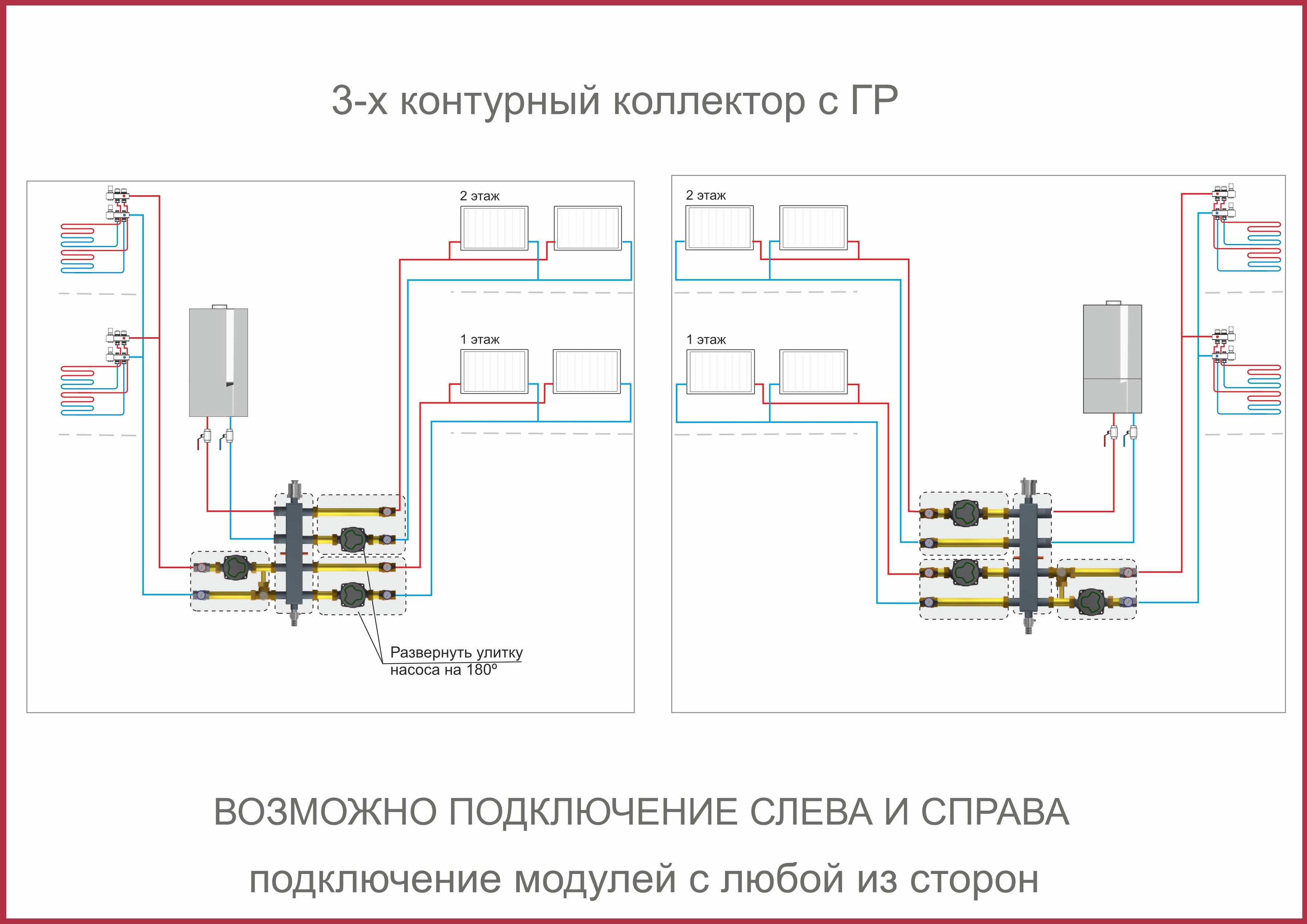 3-х контурный коллектор со встроенным гидравлическим разделителем разделяет первичный (котловой) и вторичный (отопительный) контур, а также распределяет теплоноситель по группам потребителей.
