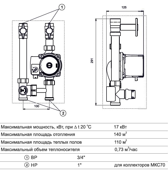 Модуль смесительный с насосом обеспечивает циркуляцию теплоносителя в системе. Насосы размещаются на подающей линии прямого отопительного контура. Трехходовой клапан обеспечивает необходимую температуру теплоносителя.